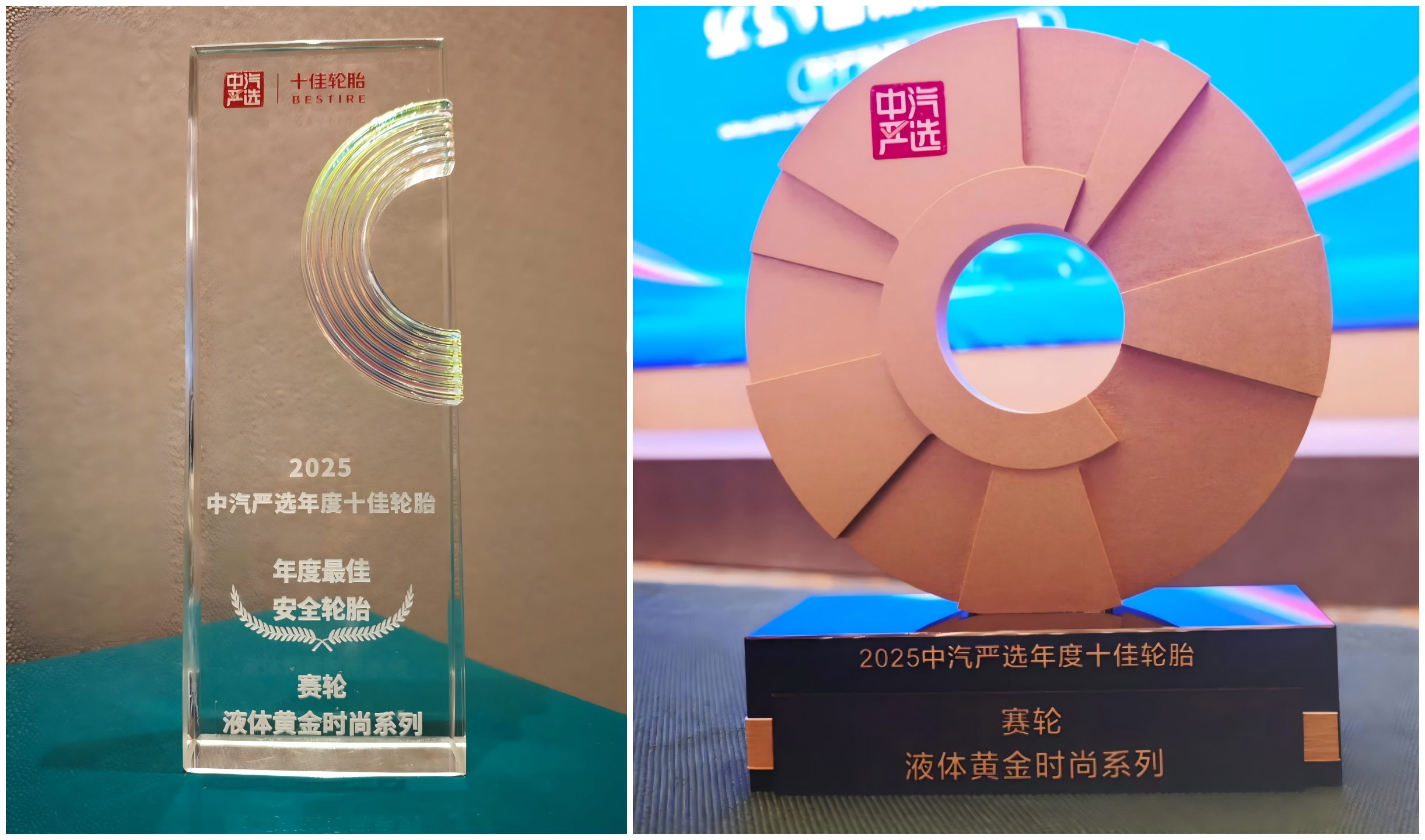 在近日于苏州举办的2025汽车安全大会上,赛轮集团推出的液体黄金轮胎时尚系列(型号235/45R18,大漠金)在“中汽严选十佳轮胎评选”中,同时获评“年度十佳轮胎”“年度最佳安全轮胎”和“年度最佳舒适轮胎”三项奖项。