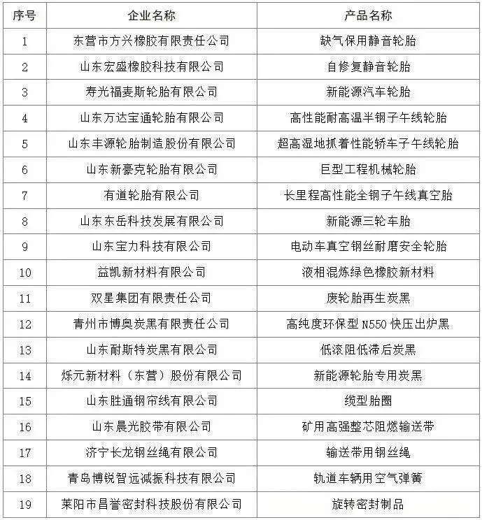 作为橡胶工业大省,山东省此次入围名单的产品涉及广泛,包括轮胎(力车胎)、橡胶及炭黑和胎圈钢丝等原辅材料、输送带、橡胶制品等。