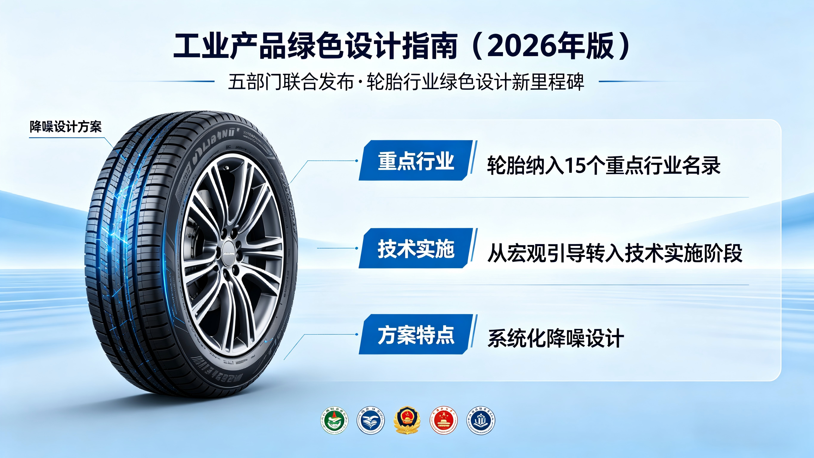 近日,五部门联合发布《工业产品绿色设计指南(2026年版)》,首次将轮胎纳入15个重点行业名录,并以轮胎为例在附件中给出系统化降噪设计方案。此举标志着轮胎绿色设计从宏观引导正式转入可操作的技术实施阶段。