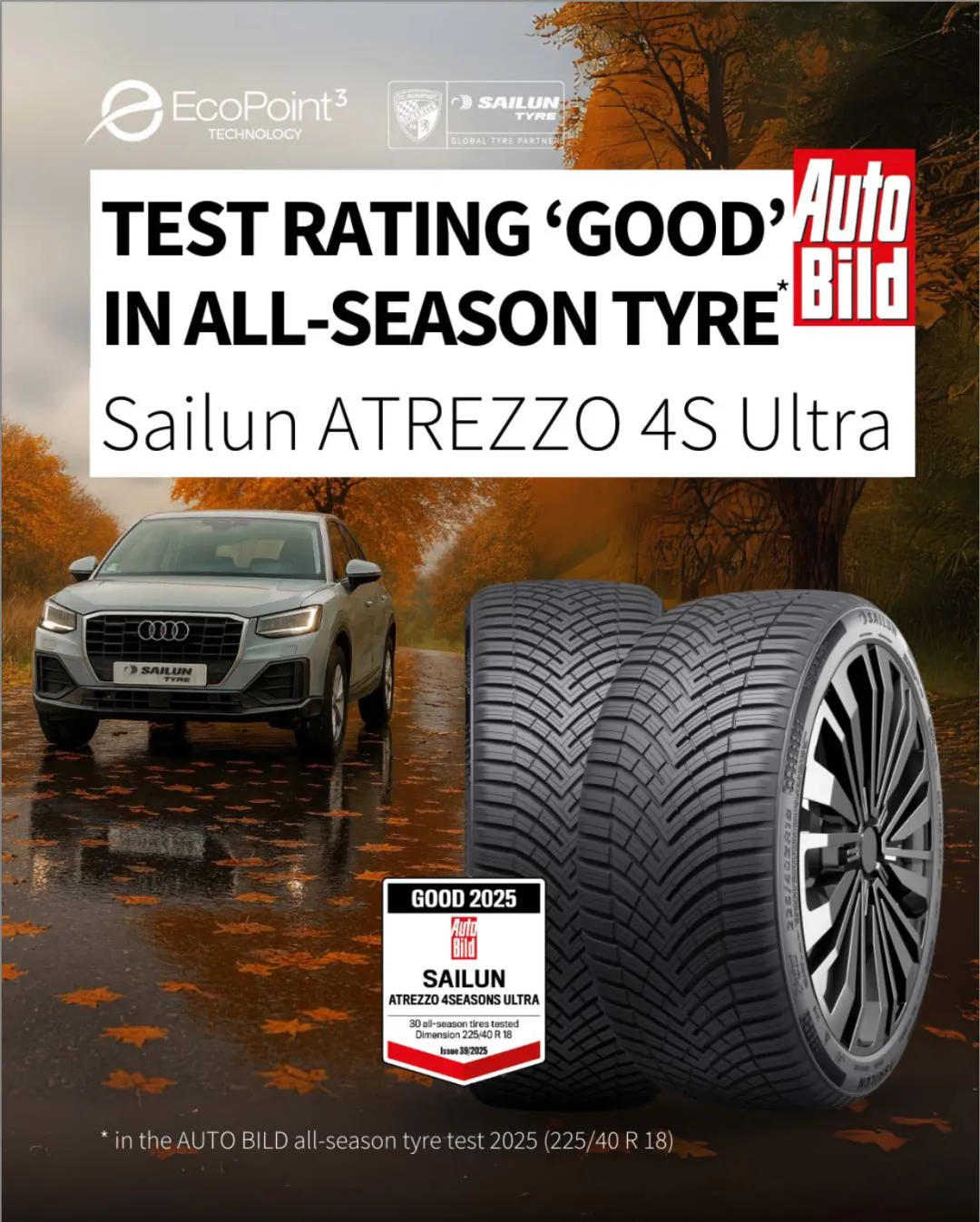 9月26日,欧洲权威汽车媒体《Auto Bild》公布最新全季轮胎测试报告,赛轮Atrezzo 4Seasons Ultra轮胎以卓越表现荣获“GOOD”评级,成为本次测评中排名最高的中国轮胎品牌。