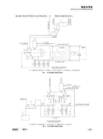 综述与专论 SPECIAL AND COMPREHENSIVE REVIEW 硫化蒸汽系统的外压凝结水回收系统见图 1,内 压凝结水回收系统见图 2。 图 1 外压凝结水回收系统图 图 2 内压凝结水回收系统图 2025 第 51 卷 ·3· 年