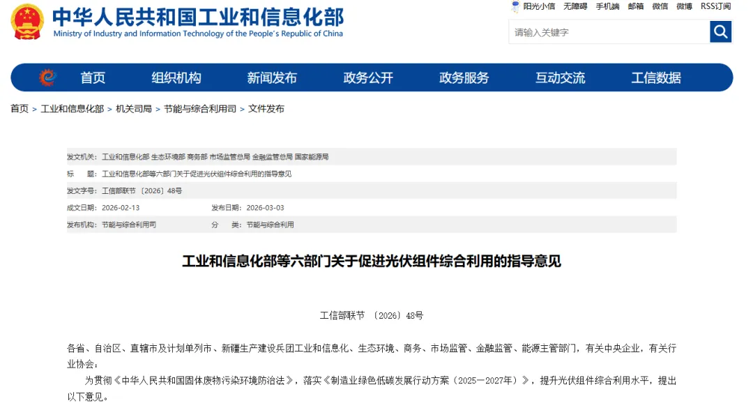 六部门联合发文:2027年光伏组件累计回收量目标25万吨 推动再生材料应用近日,工业和信息化部、生态环境部、商务部、市场监管总局、金融监管总局、国家能源局等六部门联合发布《关于促进光伏组件综合利用的指导意见》,围绕绿色设计、再生材料使用、有序报废退役等方面,为废旧光伏组件资源化利用指明方向。意见明确了2027年和2030年的阶段性目标,并对关键技术突破、标准体系建设及产业协同作出系统部署。 根据意见,到2027年,光伏组件绿色生产水平将进一步提升,再生材料使用比例有效提高,组件报废评价标准和检验检测方法得到完善。技术层面,表层结构拆解、层压件高效分离、组分提取等关键技术有望取得突破;废旧光伏组件综合利用产品在金属冶炼、装备制造、建材生产等领域的应用规模将进一步扩大。同时,将制定一批相关技术标准,培育一批废旧光伏组件综合利用骨干企业,力争光伏组件综合利用量累计达到25万吨。 到2030年,目标更加长远:光伏组件综合利用技术装备水平显著提升,产业创新能力明显增强,综合利用产品应用场景不断拓展,最终形成产业链上下游协同紧密、产能布局合理、能够有效应对大规模退役潮的废旧光伏组件综合利用能力。 在推动绿色设计与制造方面,意见鼓励光伏组件生产企业采用易拆解、易分离的胶粘材料,探索非交联结构胶膜材料,为后续高效拆解创造前提。同时,鼓励选用无氟背板、无铅焊带、无铅金属浆料等绿色原材料,降低环保处置成本。这些措施从源头设计入手,为光伏组件全生命周期绿色发展奠定基础。 针对再生材料使用,意见提出支持光伏玻璃、晶硅材料、接线盒、铝边框等零部件生产企业与再生资源综合利用企业加强合作,提升再生塑料、再生硅材料、再生有色金属、再生玻璃等的使用比例。鼓励光伏组件生产企业在满足性能要求的前提下,优先采购再生材料含量高的光伏边框、金属浆料、光伏玻璃等,以提升光伏组件中再生材料的使用比例。 在报废退役环节,意见要求加快研究制定光伏组件报废评价技术标准,明确报废评价程序、技术要求和评价方法。鼓励应用无人机电致发光(EL)成像检测、热成像检测、人工智能在线监测等先进手段,有效识别组件功能结构完整性、安全水平及功率衰减情况,为组件维护与报废判定提供科学依据。 业内专家指出,随着我国光伏装机规模持续增长,未来将迎来组件退役高峰。据中国光伏行业协会预测,到2030年,我国废弃光伏组件将产生约150万吨的回收市场。此次六部门联合发文,从顶层设计层面为光伏组件综合利用规划了路径,将推动产业迈向规范化、规模化发展,助力光伏全产业链实现绿色循环。 2026-03-05 【节能环保】 -