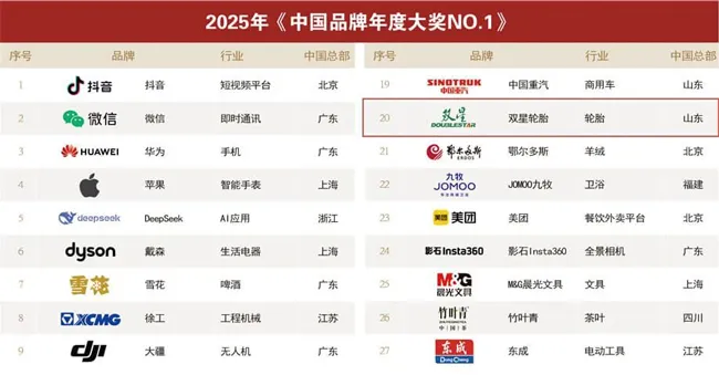 2025中国品牌年度大奖揭晓,这家轮胎公司蝉联行业第一12月17日,在世界品牌实验室于香港举办的2025世界经理人峰会上,双星轮胎与华为、雪花、徐工等35个领军品牌共同入选“中国品牌年度大奖”,并荣获“轮胎行业NO.1”及“中国轮胎十大影响力品牌”称号。 世界品牌实验室作为全球三大品牌价值评估机构之一,由诺贝尔经济学奖得主罗伯特·蒙代尔倡议创立,其专家团队来自哈佛、耶鲁、牛津等世界顶尖学府。本次评选基于长达半年的调研分析,从品牌认知度与价值等多维度进行综合评价。双星轮胎凭借在行业内的突出影响力位列榜首。 双星集团是具有百年历史的国有企业,业务覆盖橡胶轮胎、智能装备及循环利用三大板块,也是全球首家构建全产业链内生态的轮胎企业。近年来,双星坚持“第一、开放、创新”理念,持续推进品牌建设。此前,“双星轮胎”已多次获评“中国500最具价值品牌”,并在2024年成为国内首个品牌价值突破千亿的轮胎品牌。 技术创新是双星品牌发展的核心驱动力。公司先后推出全球首创的“全防爆”轿车安全轮胎、环保节能的“稀土金”卡客车轮胎,以及针对新能源汽车特点开发的EV95轮胎,全面覆盖乘用车与商用车市场的高端化、绿色化需求。 当前,中国轮胎行业正加速从“规模扩张”向“品牌引领”转型。随着新能源汽车市场快速增长及全球对轮胎安全性、环保性要求提升,具备技术积淀与品牌影响力的企业有望进一步扩大市场优势。双星表示,将以此次获奖为新起点,持续推进“生态化、高新化、当地化、数智化”战略,提升全球竞争力,向世界一流轮胎品牌迈进。 2025-12-18 【轮胎】 -