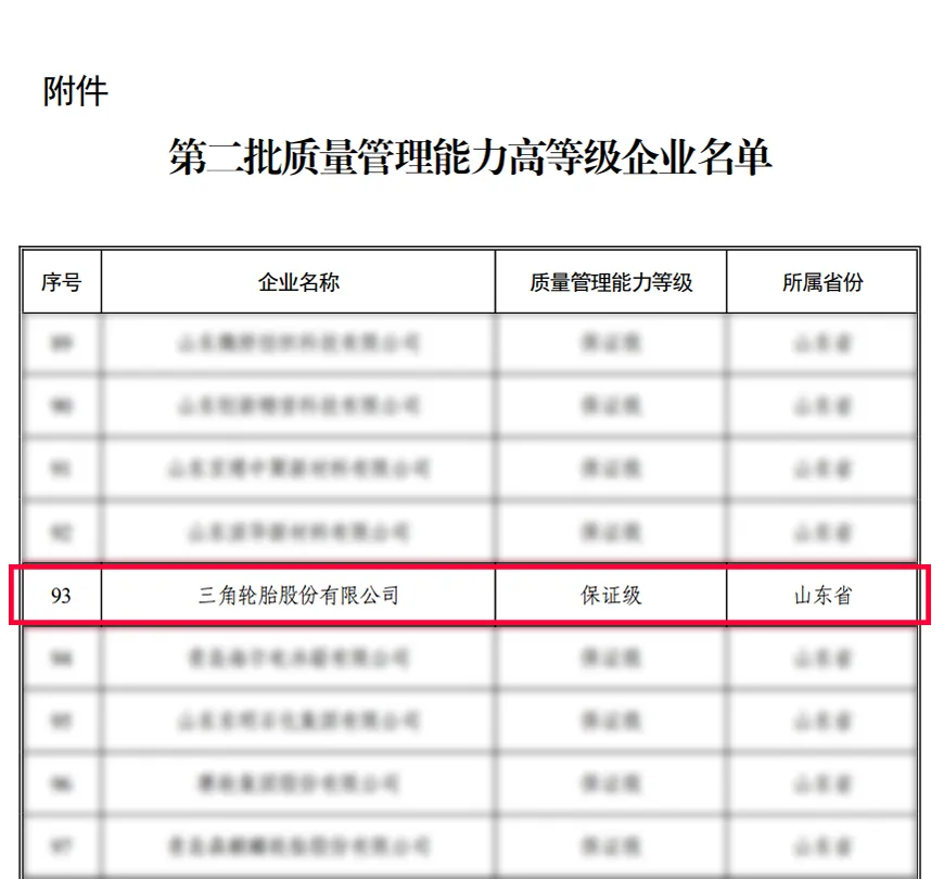 近日,工业和信息化部办公厅发布第二批质量管理能力高等级企业名单,三角轮胎股份有限公司成功入选,获评“保证级”质量管理能力高等级企业。
