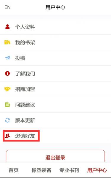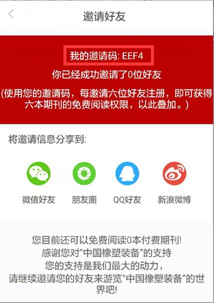 您每邀请六位好友下载“中国橡塑装备APP”,并在注册时填上您的邀请码成功注册后,您即会拥有六本收费期刊的免费阅读权限。