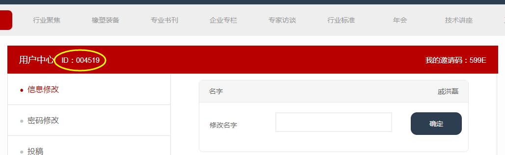 请注意,全国橡塑机械信息中心、石油和化工橡塑节能环保中心成员单位员工均可获得全年4本收费期刊的全年免费阅读权限(成员单位员工个人用户ID号,将由贵公司信息员统一上报至中心)。除此之外如若您有如下身份:全国橡胶塑料技术专家委员会专家、全国橡胶塑料设计技术中心技术委员、《橡塑技术与装备》编委或通讯员、纸刊广告联系人,请您注册后将您的用户ID号(APP端在“用户中心”-“个人资料”中,网站端在“用户中心”旁边的ID号就是,如下图)告诉我们,以便为您开通相关收费期刊的整本免费阅读权限。