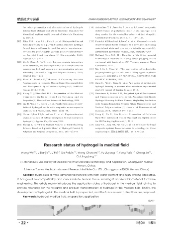 engineering. This article mainly introduces the application status of hydrogel in the medical field, aiming to
