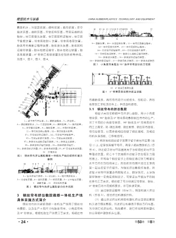 1— 锭子房导开装置 ; 3— 挤出机 ; 4— 钢丝敷胶机头 ; 架竖轴按一定角度倾斜设计,可保证压平辊压平后钢